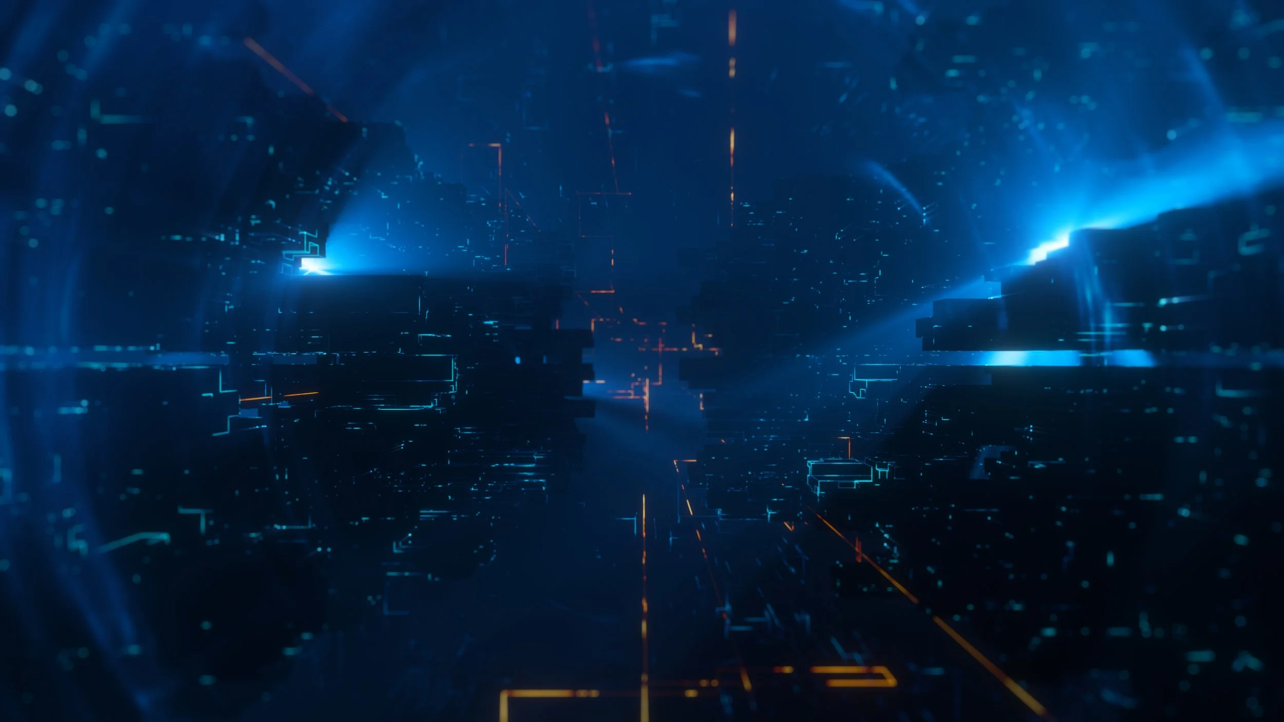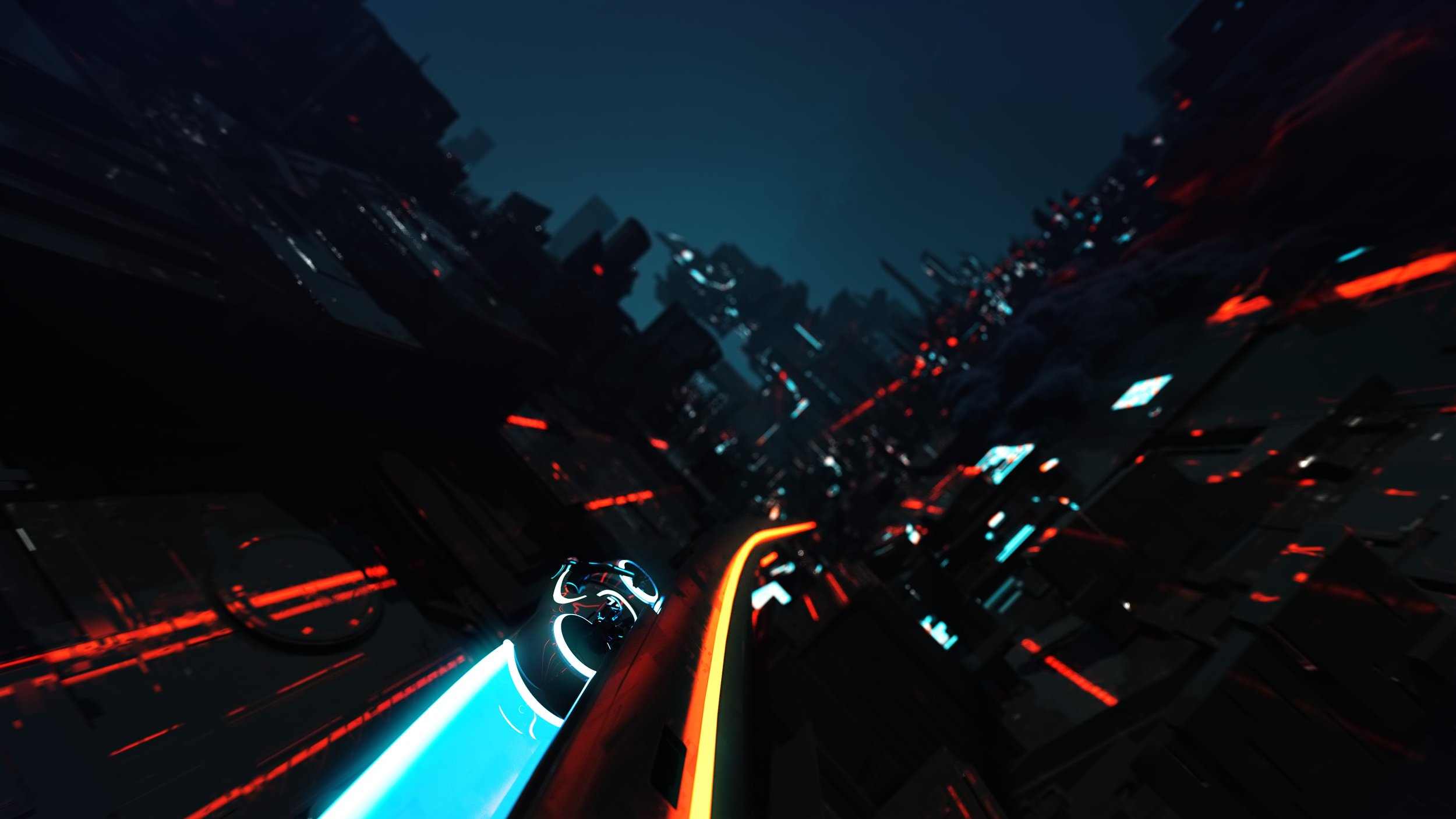 >◎//: the continuum_Since typography was such a primary element in this film, we created our own underworld beneath The Grid where the type would live - The Continuum. The look of this space is a rich void that we fly through. It’s replete with seething, humming data grids like electric freeways. A cybernated fabric of programs and codes. Here we see colorful, glitching, electric numerical expressions running like train tracks, colliding, dismantling and reforming to create the TYPOGRAPHY on multiple planes beneath.